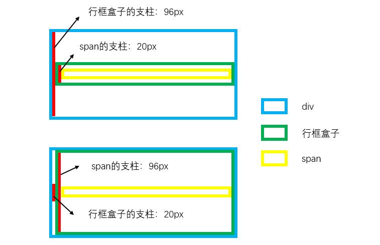 我们说支柱存在于每一个行框盒子和内联盒子前,那么我用红色的线条表示支柱,可以画出以上两种情况下的示意图: