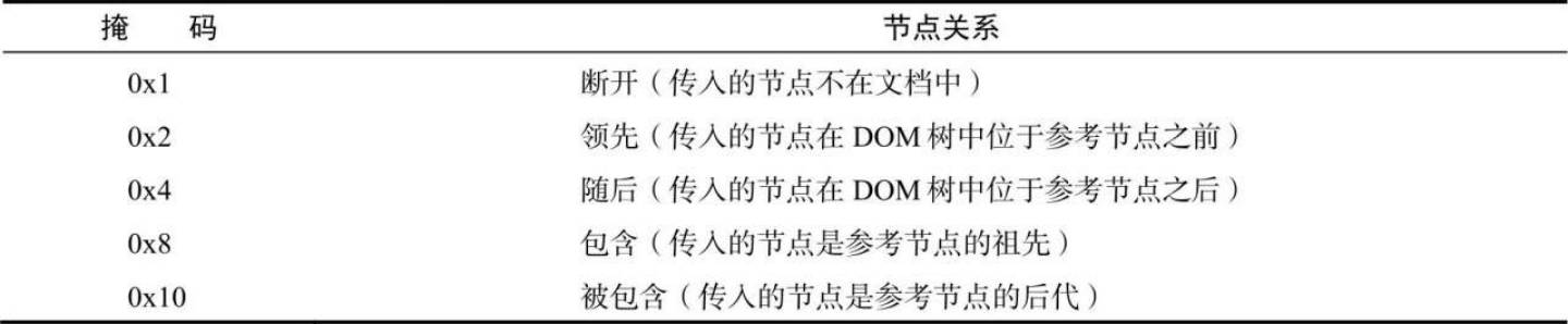 compareDocumentPosition()方法是DOM Level 3中规定的,它也可以确定节点间的关系。这个方法会返回表示两个节点关系的位掩码。位掩码的说明如下: